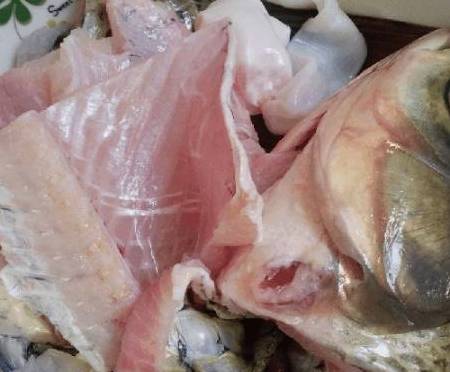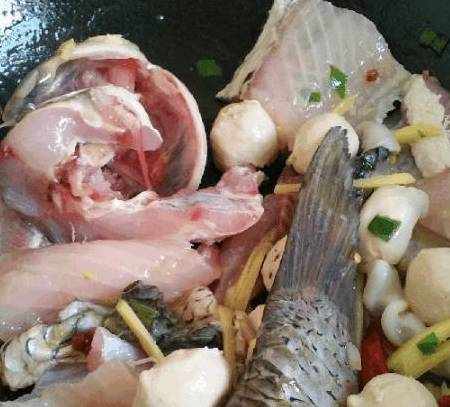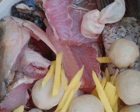 5.鱼头,鱼尾,鱼骨,鱼皮,肉丸,用生粉、盐、姜腌制20分钟。