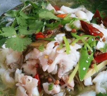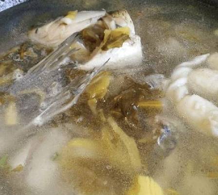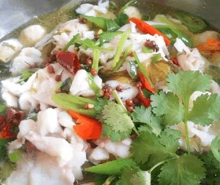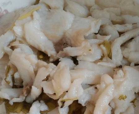 13.酸菜汤再次大火煮开,边煮边加鱼片,一片片快速加,下完所有的鱼片立即关火。然后将鱼片捞起;