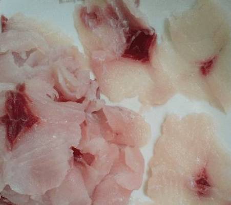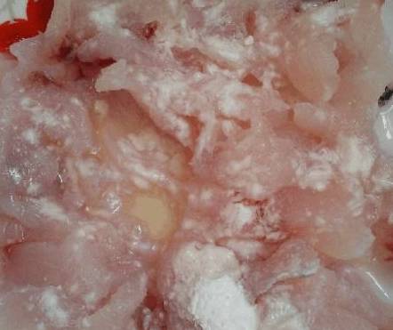 4.用生粉+盐+料酒抓过,反复洗净,重复3次,洗至鱼片透明。然后再加生粉,盐,玉米油腌制30分钟。