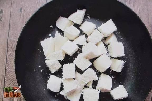 3、锅中不放油倒入馒头小火炒到表面微微焦黄