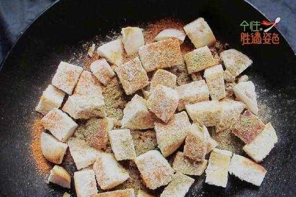 6、倒入馒头丁翻炒,加入各种烧烤粉料和盐,大火炒匀即可出锅