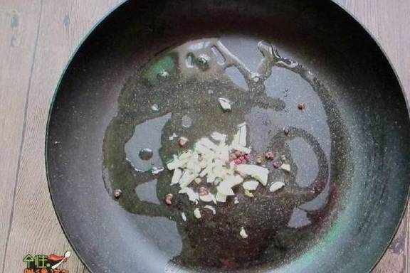 5、锅中放一点点油,爆香蒜末和花椒、麻椒