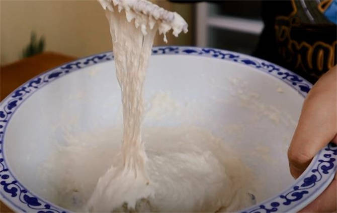 1.这个普通面粉咱们放上300g,酵母粉放上3g,白糖10g促进发酵,加入240毫克的温水,咱们和面,顺着一个方向一直搅拌到细腻比较粘稠一点的面糊,在上面封上一层保鲜膜,把它给封紧了,然后发酵60分钟左右。