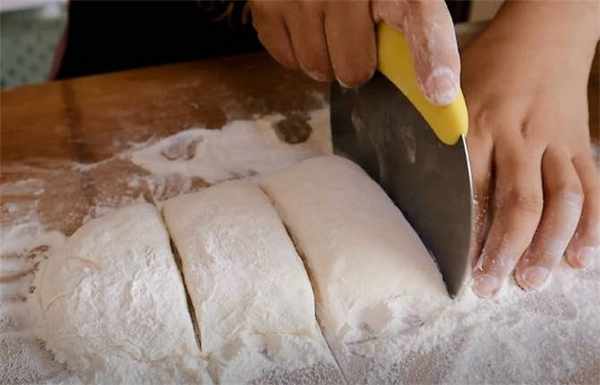 3.面太黏了,案板上多撒一点干粉,然后把面放在案板上,在上面再撒一点干粉,利用周围的面往里收,这样就不粘手了,稍微的整一整,整成长条,再切成小面剂。