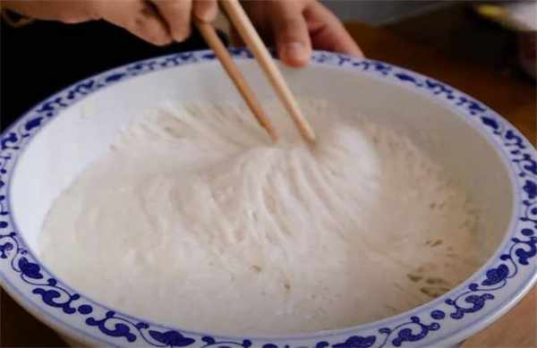 2.大约有一个小时的时间,这个面就已经发好了,拿双筷子出来搅一搅排气。