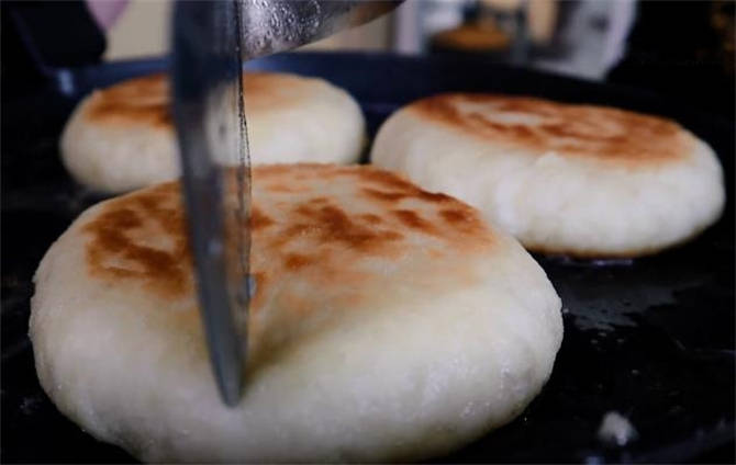 7.底面上色了,我们翻个面,又烙了大概三分钟的时间,这个饼已经完全鼓起,一按压就回弹,就代表熟了。