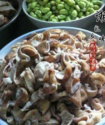 买回来的新鲜猪大肠,煮熟清洗,再煮一次,用盐抓几次,再煮再洗,反正重复几次,过程有点麻烦