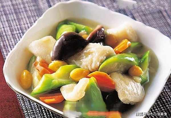 原料:冬菇25克(干)、莲子50克、竹笋50克、丝瓜500克、盐3克、味精1克