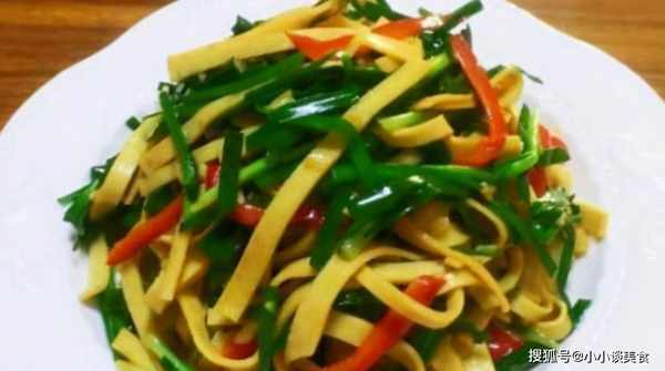 5、然后最重要的一步,先放韭菜根,不要翻过来,淋上豆腐皮,翻过来,翻过来,迅速倒入适量生抽,然后加入韭菜叶,撒上加盐,炒水,撒鸡精,中间不断搅拌,不然豆腐皮会成块,不要炒太久,加入味精即可起锅。