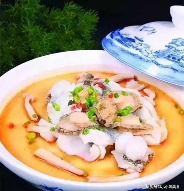 4、海鲜50克洒水,沥干水分,与龙利鱼片、鲍鱼一起放在蛋黄酱上,淋上10克蒸鱼酱油,撒上20克青红辣椒片浇在上面。加入10克热花生油即可食用