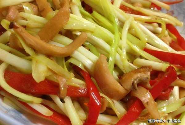 5、炒勺留底油,大火烧热,迅速加入主辅料,加入酱汁,翻炒几下,淋上葱油即可食用。