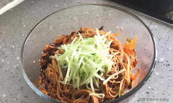 6.将爽滑的面条和调料拌匀,加入撕碎的黄瓜和胡萝卜,一碗美味的雪碧面条就做好了。