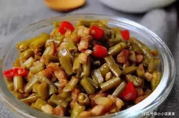 3.加入切好的腌制豇豆,中火翻炒3分钟;倒入炸好的肉丁,翻炒均匀;加少许老抽和糖调味,再翻炒2分钟,即可出锅。