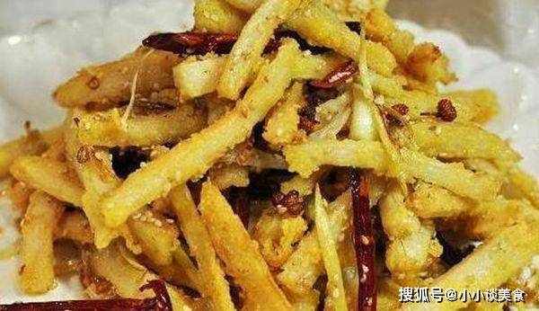 4.锅里倒入油,50%热炒藕条,捞出沥油,等油温升到70%到80%热,再下莲藕,炒至莲藕木棍干燥呈金黄色,取出;
