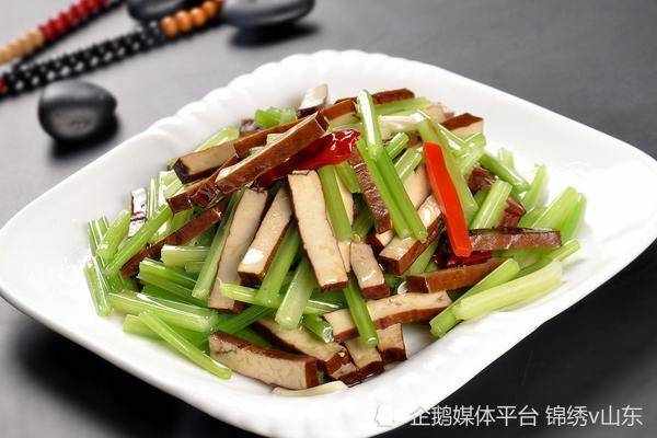 4.锅烧热,入油。油热后,入葱花,椒丝煸炒,将芹菜放入炒半分钟,再把香干倒入,滴料酒,加适量精盐、味精,翻炒几下,出勺装盘。