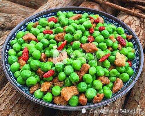 材料:豌豆300克,猪里脊肉100克,精盐1勺,油2勺,枸杞20粒,生姜5克,胡椒粉1勺