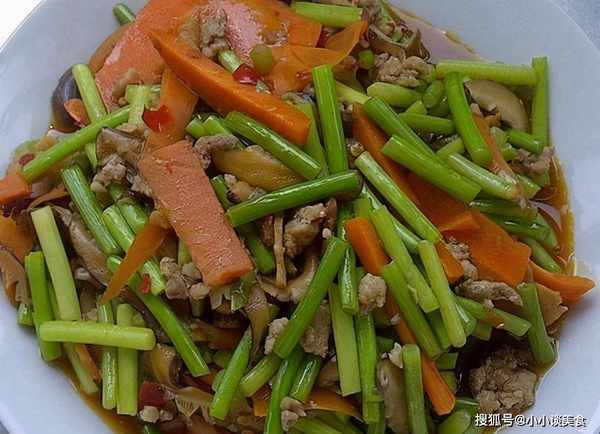 3、锅中油烧热,倒入牛里脊,炒至变色成熟,盛出备用。4.另取一个油锅,倒入胡萝卜丝翻炒。