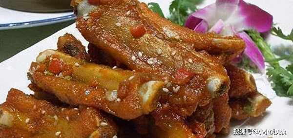 4.排骨裹上鸡蛋糊,放入50%的热油中炸,捞出沥干油。