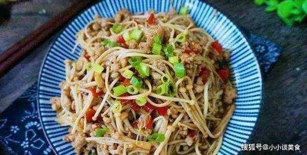 原料:金针菇300克,花椒2勺,肉末100克,酱油2勺,盐1克