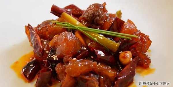 2、稍微冷却后取出牛筋,切成小块;3.热锅倒入油,加入干辣椒和刺灰,小火炒香,倒入葱蒜片;
