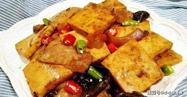 材料:千叶豆腐、青椒1条、香菇1个、胡萝卜10根、郫县豆瓣酱半个、白糖20克、生抽20克、老抽15克、老酒5克、醋15克、红薯粉20克、大蒜适量、姜2瓣、生姜2片