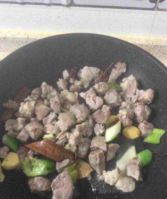 6.放入焯水后的羊肉,同时放入料酒,老抽酱油。