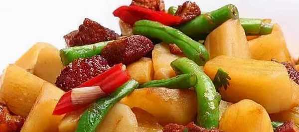 原料:豆角、牛肉、土豆、花椒、八角、桂皮、干辣椒、葱、姜