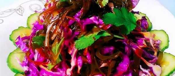 材料:干海带30克,黄瓜半条,紫甘蓝2片,香油,香菜,醋,生抽,香油,香菜,醋,生抽。
