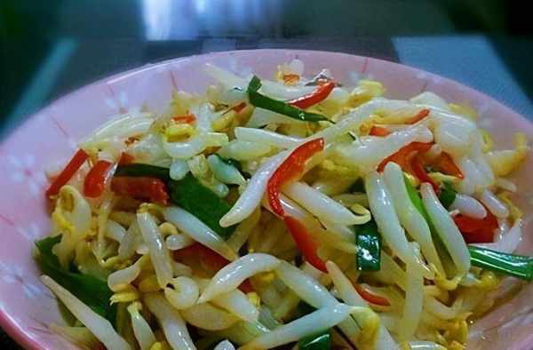 2、然后放入豆芽,开大火,快速翻炒。