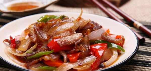 将青红椒洗净切成小块,洋葱切碎,待肉稍凉后切成薄片。热锅油烧热至70%,下葱、姜炒香,加入切好的肉翻炒。