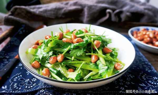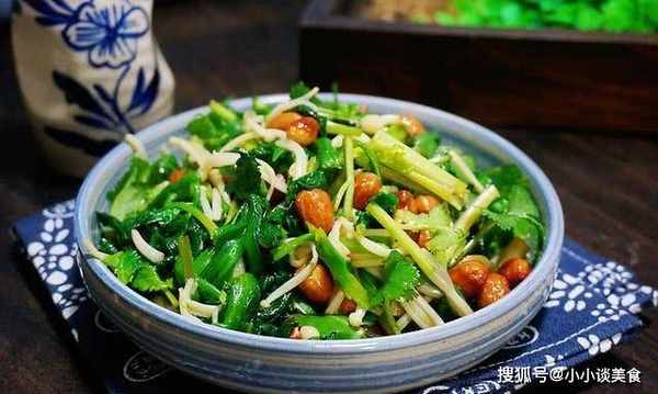 4、将汁倒入苦菊中拌匀。这道菜最好在锅里吃,否则汤容易腌,花生不脆。它可以作为餐桌上的最后一道菜。