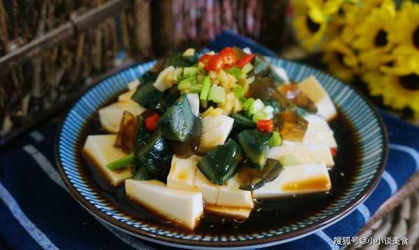 做法:1、内酯豆腐切块,皮蛋切块放在一起。