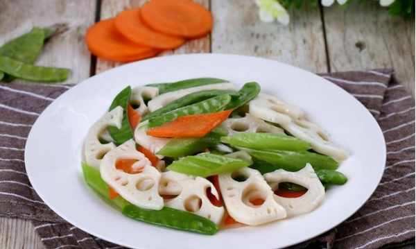 材料:莲藕200克,荷兰豆60克,油20克,盐适量,红萝卜20克,香菇2克,蚝油5克,淀粉1瓷勺