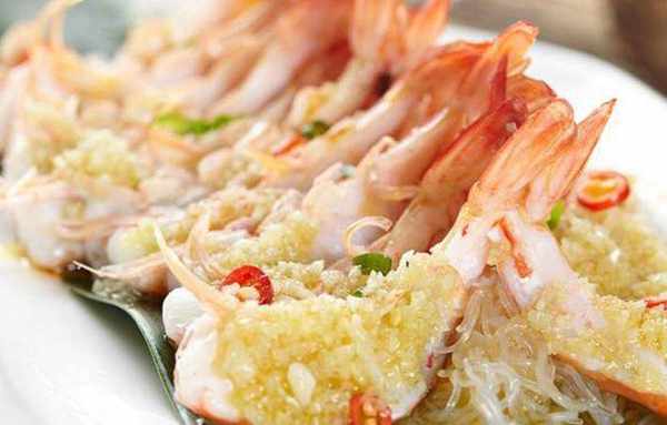 3、将好的虾洗净,去内脏、去线,尾部朝上。4)切碎的大蒜