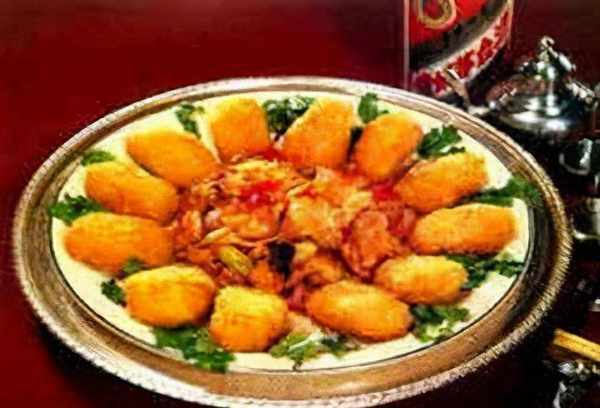 3、牛蛙抹千粉,裹上蛋液,滚上面包屑,油炸至金黄色,捞出放在玉米娃娃盘边上。煮熟的鸽胸肉挑葱、姜,加入味精、胡椒粉,用湿淀粉勾芡,淋上香油,浇在玉米娃娃上。