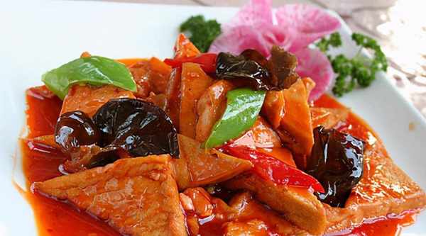 2.锅置旺火,加入烧开的植物油烧至70%热,放入豆腐炒至鸭子变黄,捞出油,倒出油,锅中再放入一锅烧开的植物油,加入剁碎的肉炒至出油,再加入豆瓣炒至油呈红色时,加入鲜汤、盐、酱油和豆腐,用中火煮至豆腐入味。加入蒜苗、味精和水、豆粉勾芡。