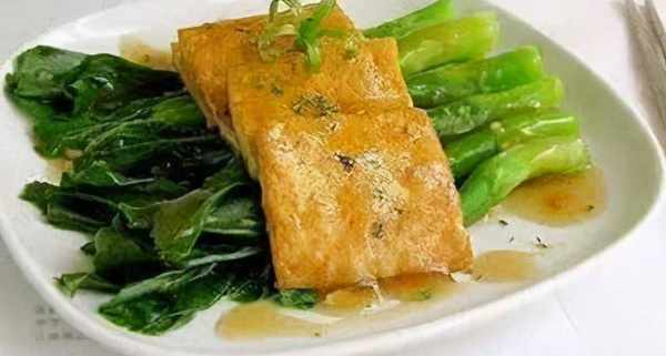 4、北豆腐洗净,切成厚薄适中的大片,起锅,倒少许油烧热,放入豆腐片小火煎至两面金黄;5.待豆腐呈金黄色时,撒上姜末爆香,加入高汤、蚝油和料酒,翻炒均匀,盖上锅盖,以中火煮滚后转小火收汤的热量,等待