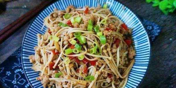 原料:金针菇300克,花椒2勺,肉末100克,酱油2勺,盐1克