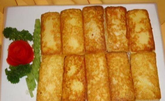 3、炒锅置火上,油锅放入猪油,倒出多余的油,锅内留少许油,将锅贴豆腐胚一个个放入,肥的一面朝下,煎上小火至肉底部变黄。豆腐糁呈淡黄色,淋上香油,放在盘子的一端;盐、糖、醋、味精、香油调至酸甜可口,与白菜丝拌匀,盛入盘中。