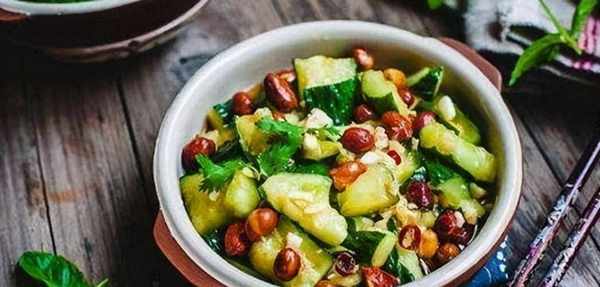 材料:黄瓜1条、花生仁50克、大蒜3瓣、辣椒油、白糖少许、酱油少许、盐适量、香油少许、香醋少许