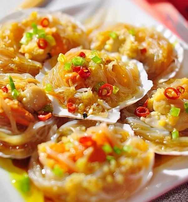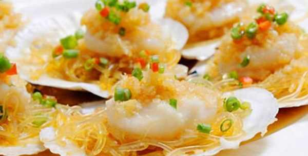 2.将粉丝放入扇贝中。将大蒜切碎炒熟,放在面条上。
