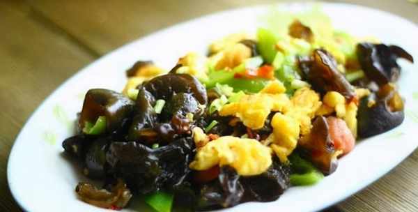 材料:鸡蛋3个,泡发黑菇1把,青椒1个,油、盐适量。