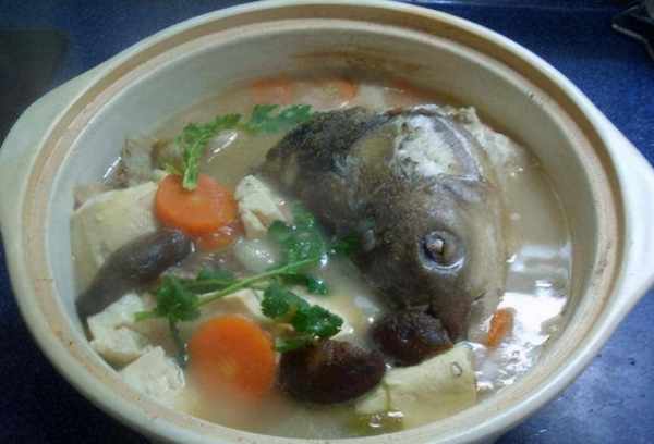 3、拌匀后倒入开水,关大火后转中火慢炖。砂锅烧热十分钟左右,鱼头放入锅中。