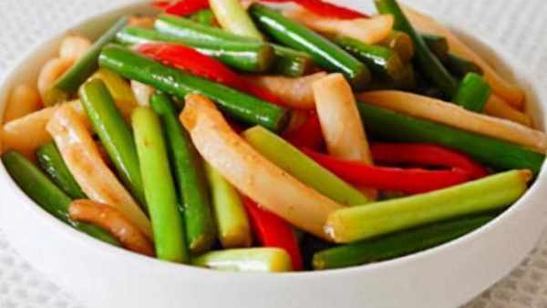 原料:蒜苔100克,鱿鱼300克,香菇10克,鲜露5克,料酒7克,药明