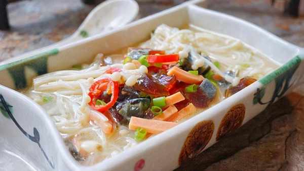 材料:金针菇250克,火腿肠1条,皮蛋1个,高汤1只,盐适量,蒜头4瓣,红辣椒适量,水淀粉2汤匙