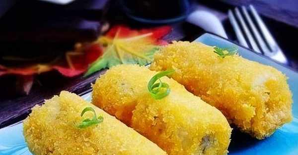 4、然后剥去外皮,盖上一层蛋液,再盖上一层面包屑。