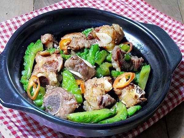 材料:排骨500克,苦瓜1条,红辣椒1条,豆豉适量,色拉油少许,冰糖2克,鸡精2克,大蒜5克,大蒜5克料酒,10件。生抽5克,老抽5克