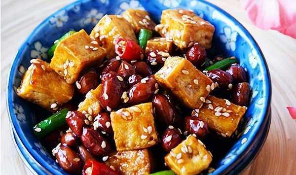 1.将核桃炸熟备用;豆腐焯水切成小方块,锅里放油烧热,将豆腐块炸至金黄色,捞出沥干油备用。