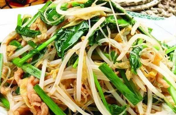 加入胡萝卜丁,大火炒至胡萝卜丝变软,然后加入韭菜,翻炒几下,再加入豆芽和蚝油,快速翻炒即可食用。