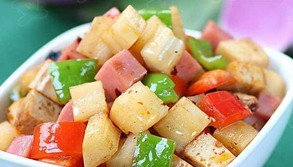 1)青红椒去蒂去籽,洗净切丁。将火腿切片。干豆腐块。莲藕洗净、洗净、切碎